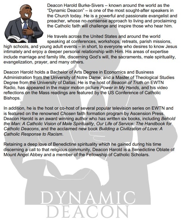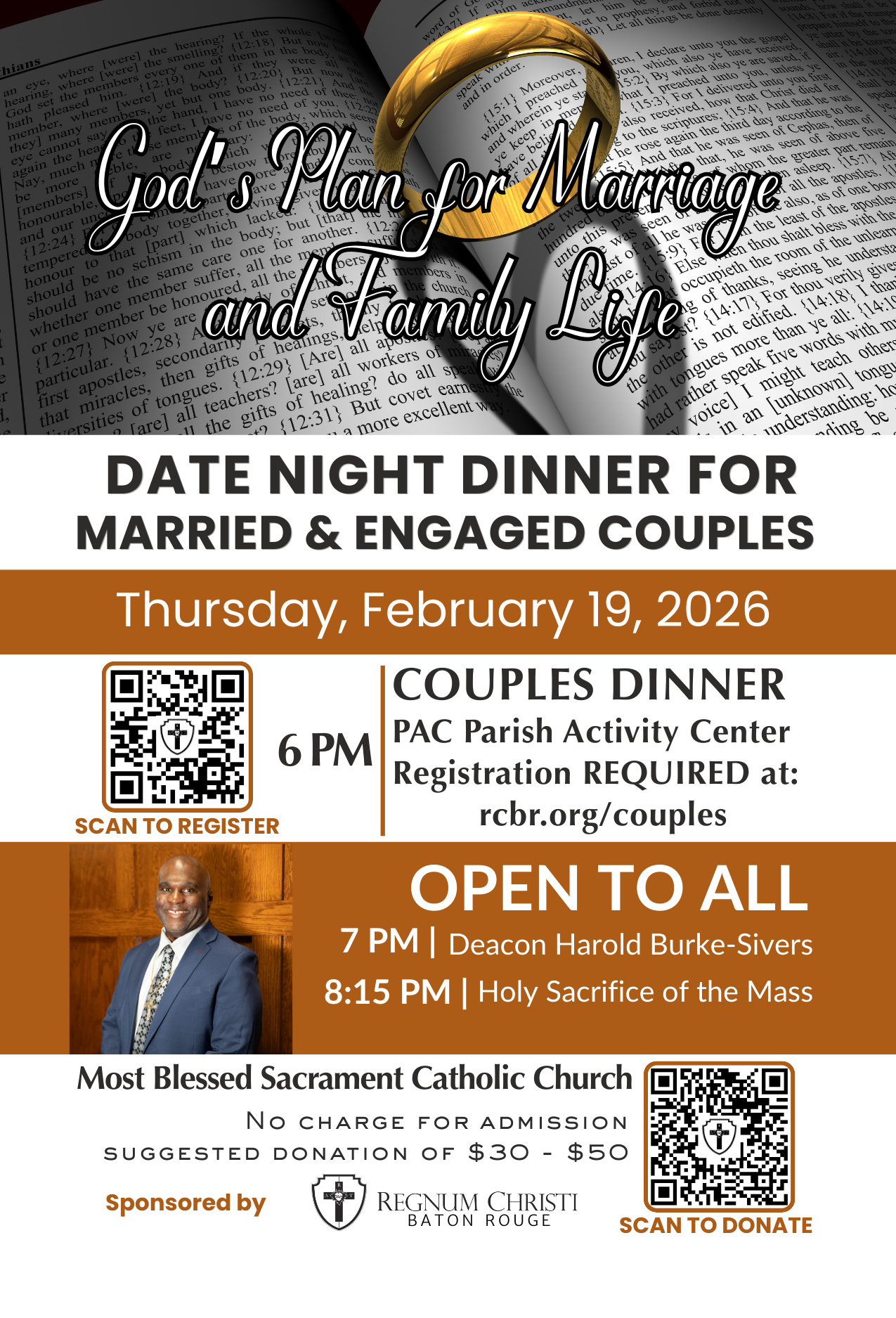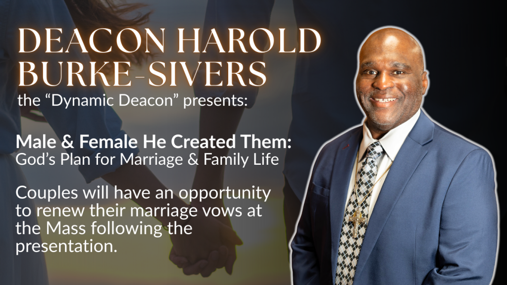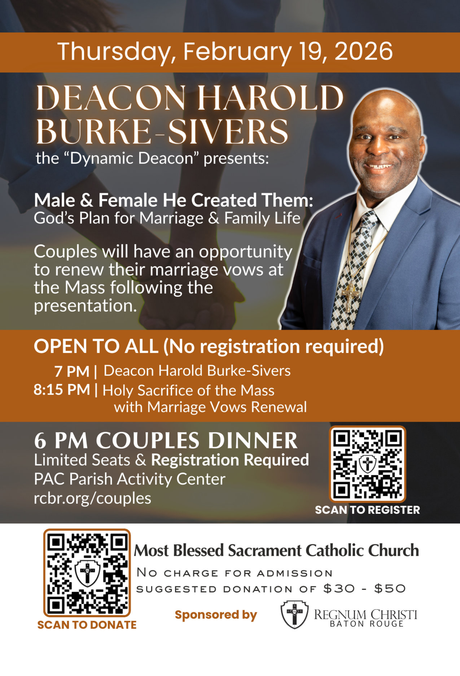 Strengthen your marriage with an evening designed to nourish both your relationship and your faith. Join us for a special Date Night Dinner followed by an inspiring talk from Deacon Harold Burke-Sivers, known worldwide for his powerful teachings on Catholic marriage, family life, and spiritual leadership.