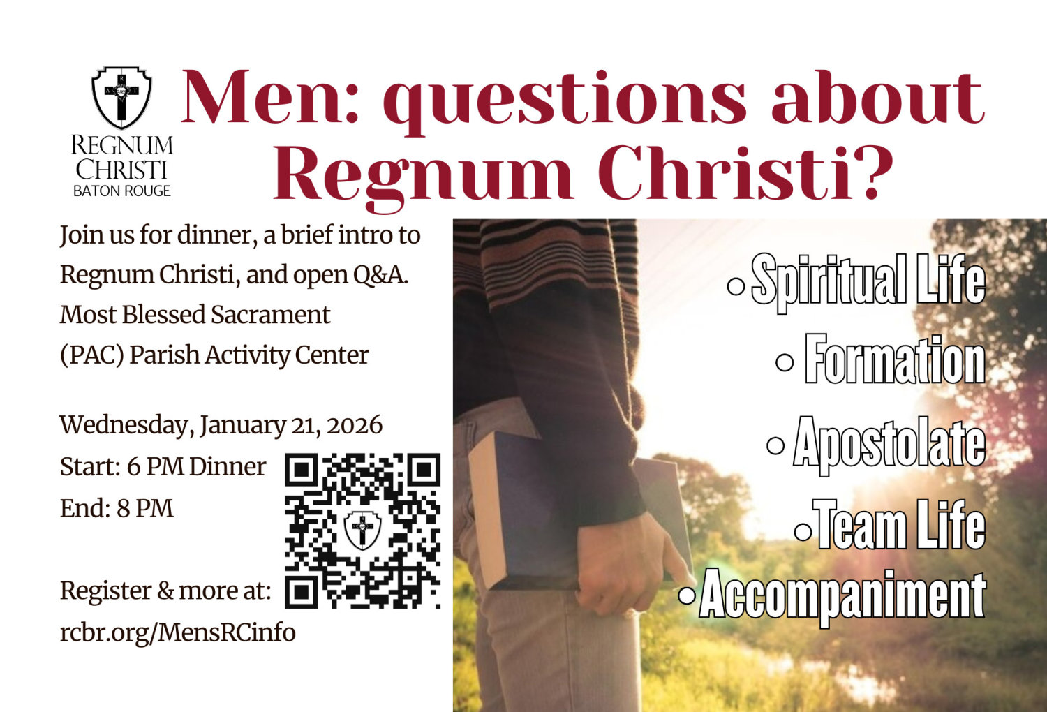 Join us for dinner, a brief intro to Regnum Christi, and open Q&A. We’ll wrap up before 7:00 PM parish adoration.